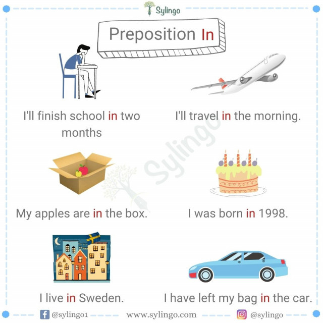 نستخدم حرف الجر In للدلالة على الأماكن على نطاق واسع مثل الدول والبلدان، وقد تأتي بمعنى "في داخل" مع الأدوات والأشياء مثل صندوق أو مع المساحات المغلقة مثل المباني.