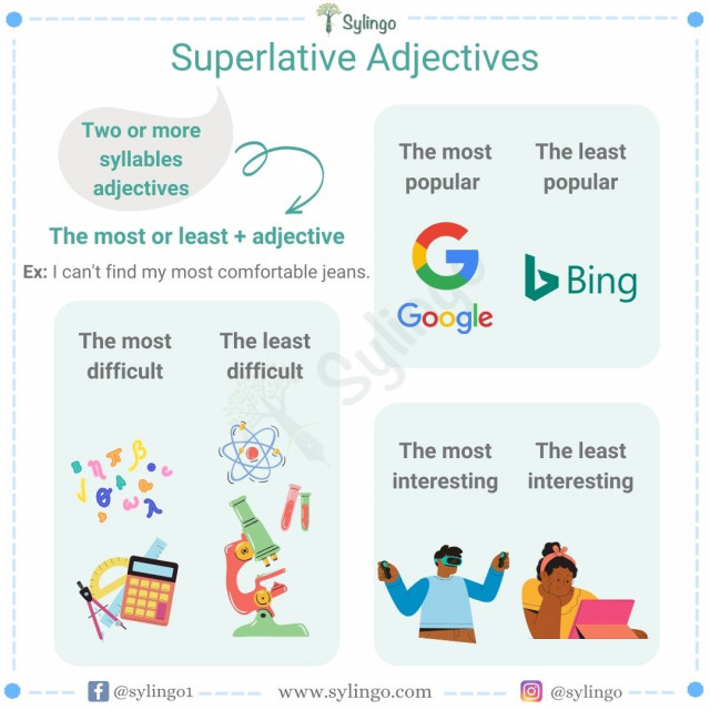 2- في حال كانت الصفة تتألف من مقطعين أو أكثر نضيف قبلها The most أي يعني (الأكثر) للتعبير عن أعلى درجات الصفة أو The least ويعني (الأقل) للتعبير عن أدنى درجات الصفة.