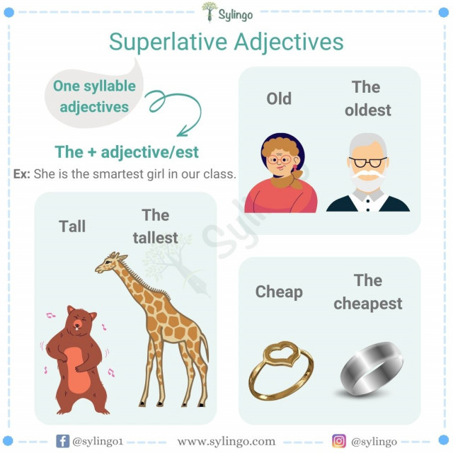 1- في حال كانت الصفة تتألف من مقطع واحد نضيف أداة التعريف The قبل الصفة ونضيف الأحرف est إلى نهاية الصفة.