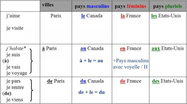 الخلاصة: أسماء المدن تأخذ حرف الجر à دائماً وأسماء المدن تأتي بدون أدوات التعريف إلا في بعض الحالات الاستثنائية التي تكون فيه أدوات التعريف le و la و les من أصل اسم المدينة في هذه الحالات أما نضع au أو à La أو aux.