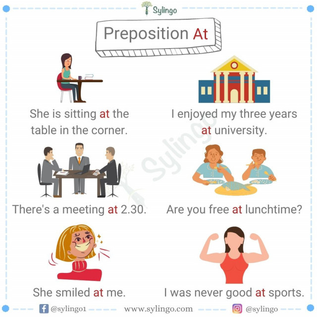 نستخدم حرف الجر At عند الحديث عن وقت محدد أو ساعة معينة وأوقات اليوم وأوقات تناول الوجبات.